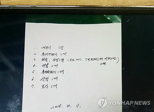 | △ '성완종 전 회장 유품 확인서' (서산=연합뉴스) 이재림 기자 = 10일 공개된 성완종 전 경남기업 회장 유품 확인서를 촬영한 사진. 수사기관이 적어준 것으로 보이는 이 확인서에는 성 전 회장이 정치권에 금품을 전달한 정황을 적은 메모지 1장(1번)이 포함돼 있다. 경남기업 전 상무는 "유족 측은 해당 메모지를 전달받거나 내용 자체를 확인할 수 없었다"고 밝혔다. |