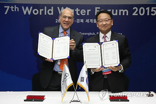 △ 국토부, OECD와 물관리 정책 공동연구 추진 (서울=연합뉴스) 유일호 국토교통부 장관(오른쪽)과 앙헬 구리아 경제협력개발기구(OECD) 사무총장이 지난 12일 대구 엑스코에서 OECD 회원국들의 물 수요 관리정책을 비교, 국내 실정에 맞는 정책 시사점을 찾아내는 공동연구를 진행하기 위한 협력의향서를 체결하고 있다. << 국토교통부 제공 >> photo@yna.co.kr