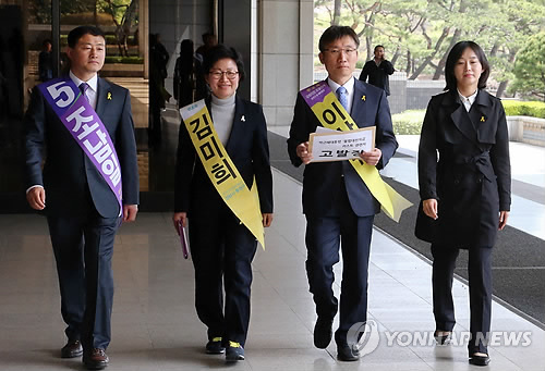 △ 고발장 접수하는 옛 통합진보당 관계자들 (서울=연합뉴스) 최재구 기자 = 이상규 전 의원을 비롯한 옛 통합진보당 관계자들이 '성완종 리스트'에 오른 인물 중 일부를 검찰에 고발하기위해 13일 서초구 서울중앙지검으로 들어서고 있다. 김재연(오른쪽부터), 이상규, 김미희 전 의원과 조남일 전 민주노총 광주전남본부장은 허태열 전 대통령 비서실장과 홍준표 경남지사, 새누리당 홍문종 의원에 대한 고발장을 서울중앙지검에 제출했다. 2015.4.13 jjaeck9@yna.co.kr