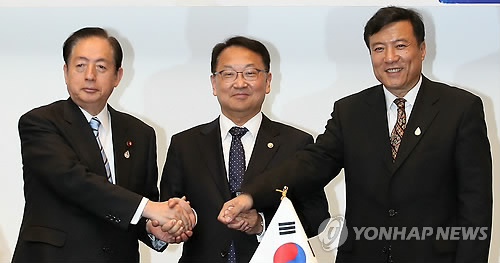 △ 제2차 한·일·중 수자원 장관회의 (경주=연합뉴스) 한종찬 기자 = 13일 오후 경주 현대호텔에서 열린 2015 대구·경북 세계물포럼 '제2차 한·일·중 수자원 장관회의'에서 오타 아키히로 국토교통장관(왼쪽부터), 유일호 국토교통부 장관, 자오 융 중국 수리부 부부장이 손을 맞잡고 포즈를 취하고 있다. 2015.4.13 saba@yna.co.kr