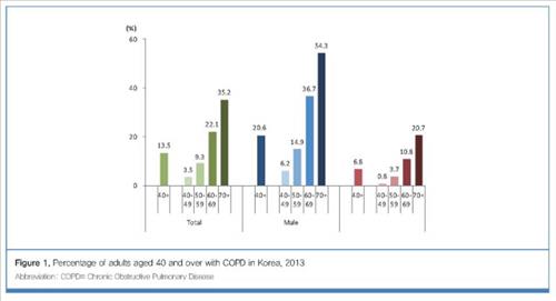 14일 보건복지부 질병관리본부가 발표한 '우리나라 40세 이상 성인에서의 만성폐쇄성폐질환 유병률(전채민·오경원)' 보고서에 따르면 2013년 국민건강영양조사 결과를 토대로 분석한 결과, 40대 이상 남녀의 만성폐쇄성폐질환 유병률은 13.5%이어서 7~8명 중 1명꼴로 이 질환을 앓고 있는 것으로 조사됐다.