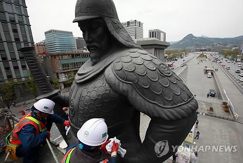 (서울=연합뉴스) 이정현 기자 = 박원순 서울시장은 충무공 이순신 장군 탄신 470주년(28일)을 앞둔 14일 오전 광화문광장에서 이순신 장군 동상의 묵은 때를 씻어내는 친수식에 참여한다.
