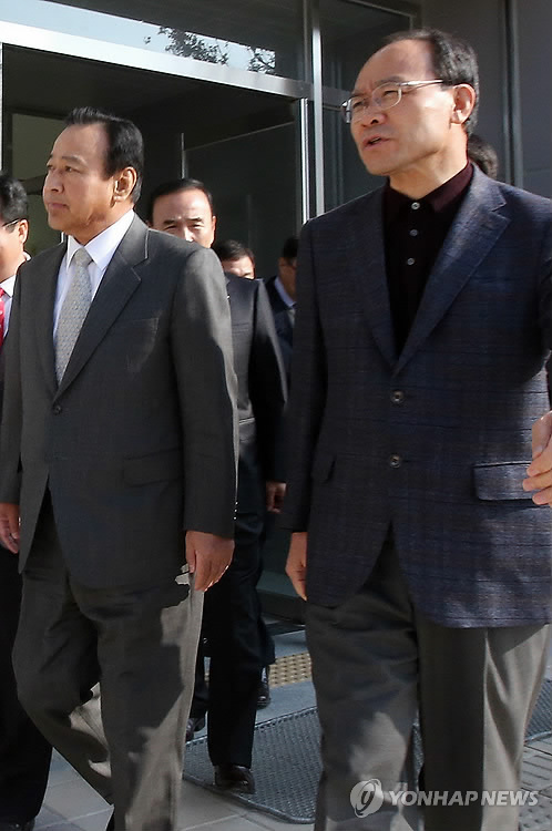| △ 2013년 12월 3일 이완구 총리가 새누리당 세종시 지원 특위 위원장이었던 시절 성완종 당시 의원과 정부세종청사를 방문해 입주를 앞둔 2단계 공사현장을 둘러보고 있는 모습. (연합뉴스 자료사진) |