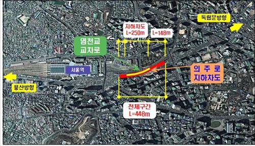 (서울=연합뉴스) 황희경 기자 = 서울시는 서울역전터미널 앞 의주로지하차도를 통과해 용산 방향으로 가는 차량과 염천교 사거리에서 남대문 방향으로 가는 차량의 교차 엇갈림 구간을 해소하기 위해 25일부터 의주로지하차도 용산 방향 2개 차로를 폐쇄한다고 14일 밝혔다.