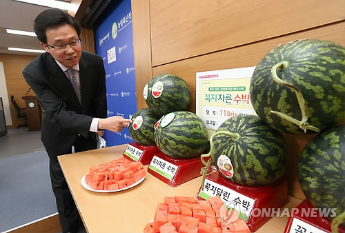 이달 하순부터 농협 수도권 유통센터 6곳에서 꼭지 없는 수박 120t을 시범 판매한다. 이어 수박 성수기인 5∼8월에 대형마트, 도매시장 중도매인 등을 통해 4천600t을 유통할 예정이다.
