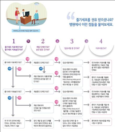 정보집에 따르면 의료기관은 NECA의 안전성·유효성 검토를 거쳐 복지부 신의료기술평가위원회의 승인을 받은 줄기세포 치료술에 대해서만 환자에게 치료비를 청구할 수 있다.