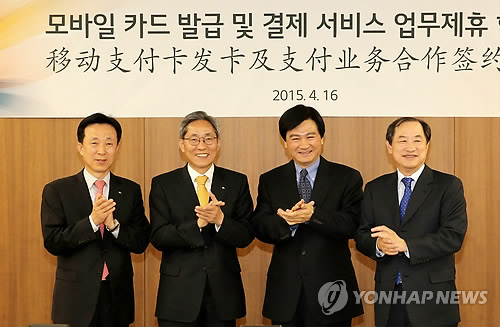 | △ KB국민카드, 중국 모바일 카드결제시장 진출 (서울=연합뉴스) 16일 서울 LG유플러스 용산 신사옥에서 열린 '모바일 카드 발급 및 결제 서비스 업무 제휴 협약식'에서 김덕수 KB국민카드 사장(왼쪽부터), 윤종규 KB금융그룹 회장, 거화용 차이나유니온페이 및 유니온페이인터내셔널 동사장, 이상철 LG유플러스 부회장이 기념 촬영을 하고 있다. KB국민카드와 LG유플러스는 오는 7월부터 유니온페이 모바일 카드를 발급하기로 했다. 이 카드를 소지하고 중국을 방문하면 스마트폰 터치 방식의 단말기 500여만대를 통해 결제 서비스를 받을 수 있다. 2015.4.16 << KB국민카드 제공 >> photo@yna.co.kr |
