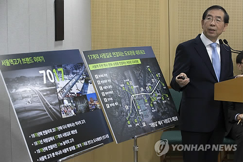 | △ 박원순 서울시장이 지난 1월 29일 오전 서울시청 브리핑룸에서 열린 기자회견에서 서울역 고가를 보행로로 만드는 '서울역 7017 프로젝트'를 발표하고 있다. (연합뉴스 자료사진) |
