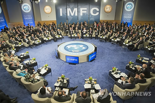 △ 세계은행이 18일(현지시간) 미국 워싱턴 D.C에서 개최한 개발위원회에서는 반기문 유엔 사무총장, 김용 세계은행 총재, 최경환 경제부총리 겸 기획재정부 장관이 머리를 맞대고 지구촌 문제들을 논의했다. 사진은 이날 열린 IMF 국제통화금융위원회(IMFC) 모습. (EPA=연합뉴스)