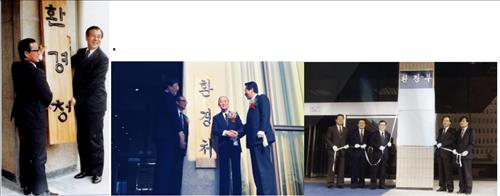 | △ 환경청 현판식(1980년·왼쪽부터 진의종 보사부장관, 박승규 초대 환경청장), 환경처 현판식(1990년·강영훈 국무총리(오른쪽 두 번째)와 조경식 초대 환경처장관(왼쪽 두 번째)), 환경부 현판식(1994년·김중위 초대 환경부장관(왼쪽 세 번째)) |
