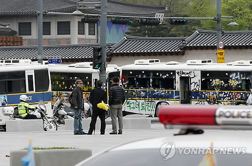 △ 만신창이 된 경찰 버스 (서울=연합뉴스) 윤동진 기자 = 19일 오전 서울 광화문 앞에 지난 밤 '세월호참사 범국민대회' 행진 참가자들에 의해 손상된 경찰버스가 서 있다. mon@yna.co.kr