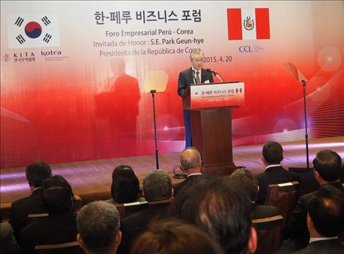 | △ 20일(현지시간) 페루 수도 리마 쉐라톤호텔에서 개최된 '한·페루 비즈니스 포럼'에서 김인호 한국무역협회장이 개회사를 하고 있다. |