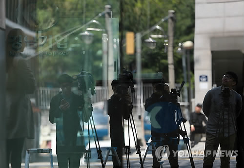 | △ 경남기업 3차 압수수색 (서울=연합뉴스) 홍해인 기자 = 성완종(64) 전 경남기업 회장의 정치권 금품제공 의혹 사건을 수사하는 검찰 특별수사팀이 경남기업 본사에 대한 3차 압수수색을 실시한 21일 오후 서울 동대문구 답십리동 경남기업 본사에서 취재진들이 검찰 관계자들이 나오기를 기다리고 있다. |