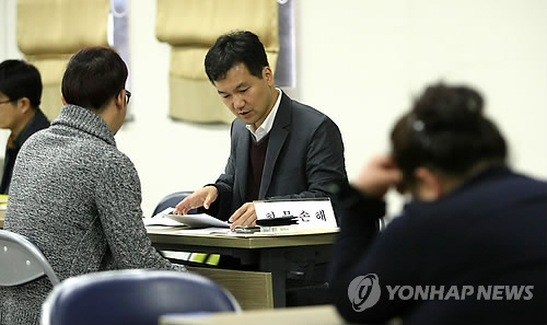 | △ 세월호 배상금 신청하는 피해자들 (제주=연합뉴스) 변지철 기자 = 20일 제주도청 2청사 자유실에서 제주지역 세월호 사고 피해자들이 배상금 지급 신청을 하고 있다. 이날 시작된 피해 접수는 인적 피해와 화물 손해 등 2개 분야로 나눠 22일까지 3일간 진행된다. 2015.4.20 bjc@yna.co.kr |