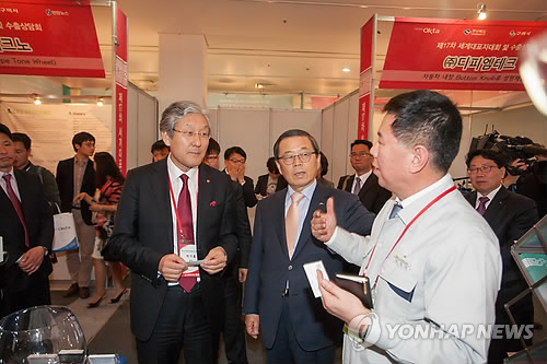 | △ 월드옥타 구미대회 '해외 바이어 초청 수출 상담회' 성황 (구미=연합뉴스) 강성철 기자 = 23일 오후 경북 구미시 컨벤션센터인 구미코에서 열린 '수출상담회'에는 해외 진출을 꿈꾸는 구미 지역 중소기업70여 곳의 제품이 전시돼 재외동포 기업인과 활발하게 상담을 진행했다. |
