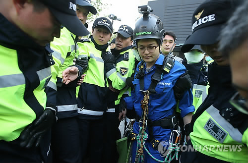 △ 연행되는 그린피스 활동가 (서울=연합뉴스) 서명곤 기자 = 23일 오전 원자력안전위원회가 입주해 있는 서울 광화문 KT 빌딩에서 그린피스 활동가가 신고리원자력발전소 3호기 가동 승인을 반대하는 고공농성을 벌이다 경찰에 연행되고 있다.
