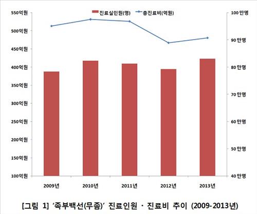 26일 국민건강보험공단의 건강보험 지급자료(2009~2013년)에 따르면 흔히 무좀으로 불리는 '족부백선(질병코드 35.3)'으로 2013년 병원을 찾은 환자는 83만명이었다.
