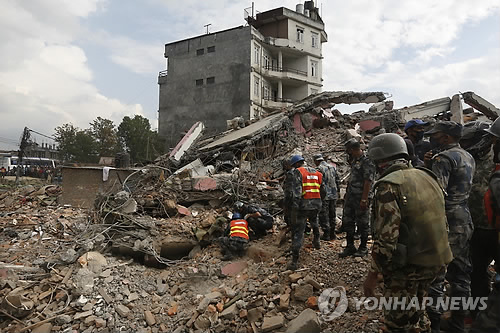 | △ 네팔 대지진 사망자 2천500명 넘어서 (카트만두 AP=연합뉴스) 네팔을 강타한 대지진으로 인한 사망자가 계속 늘어나 26일(현지시간) 2천500명을 넘어섰으며 네팔 당국은 사망자가 4천500명에 달할 수 있다고 전망했다. 부상자도 6천명 이상에 이르는 것으로 알려졌다. 사진은 네팔 경찰들이 카트만두의 붕괴된 건물 잔해 속에서 구조작업을 펴고 있는 모습. marshal@yna.co.kr |