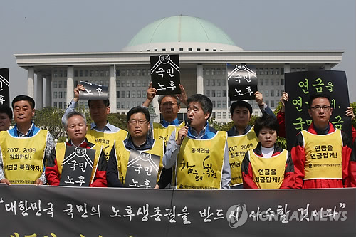 | △ 공노총 단식투쟁 돌입 기자회견 (서울=연합뉴스) 박동주 기자 = 27일 오전 서울 국회 앞에서 대한민국공무원노동조합총연맹 관계자들이 전국동시 단식투쟁 돌입 기자회견을 열고 손팻말을 들고 있다. 공노총은 "공무원연금 개악 및 연금민영화에 맞서 국민노후생존권을 사수하기 위해 이날부터 5일간 전국에서 동시에 단식투쟁에 돌입한다"고 밝혔다. pdj6635@yna.co.kr |