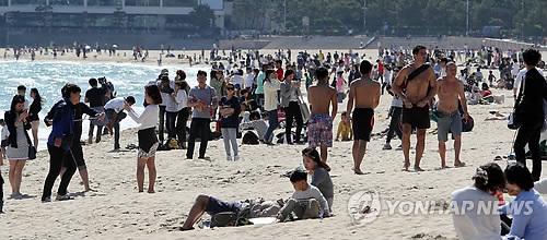 △ 4월 더위 해운대 북적 (부산=연합뉴스) 조정호 기자 = 초여름 날씨를 보인 26일 부산 해운대해수욕장에서 나들이객들이 더위를 식히고 있다.