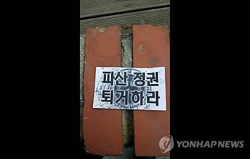| △ (서울=연합뉴스) 설승은 기자 = 27일 오전 청년단체 회원을 포함한 20대 추정 청년 11명이 총리공관 인근에서 정권퇴진 시위를 하며 전단을 뿌리다 연행됐다. 전단에는 '파산정권 퇴거하라'는 문구가 적혀있다. 2015. 4. 28 ses@yna.co.kr |