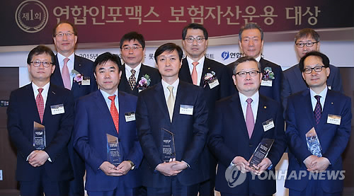 △ 제1회 연합인포맥스 보험자산운용 대상 시상식 (서울=연합뉴스) 김도훈 기자 = 30일 오전 서울 중구 롯데호텔에서 열린 제1회 연합인포맥스 보험자산운용 대상 시상식에서 수상자 및 시상자들이 기념촬영을 하고 있다. 앞줄 왼쪽부터 알리안츠생명 박대양 실장, 삼성생명 전영묵 전무, 삼성화재 박인성 본부장, 동부화재 정경수 부사장, 신한생명 김무하 상무, 뒷줄 왼쪽부터 손해보험협회 장남식 회장, 연합인포맥스 이선근 사장, 진웅섭 금융감독원장, 생명보험협회 이수창 회장, 연합인포맥스 이상인 전무. 이날 시상식에서 삼성화재가 대상을, 동부화재가 손해보험 최우수상, 삼성생명이 생명보험 최우수상, 신한생명이 리스크관리상, 알리안츠생명이 혁신상을 각각 수상했다.