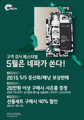 (서울=연합뉴스) 전준상 기자 = 아웃도어 브랜드 네파가 5월 가정의 달을 맞아 사은품 증정과 각종 할인 혜택을 제공하는 '고객 감사 페스티벌' 프로모션을 전개한다.