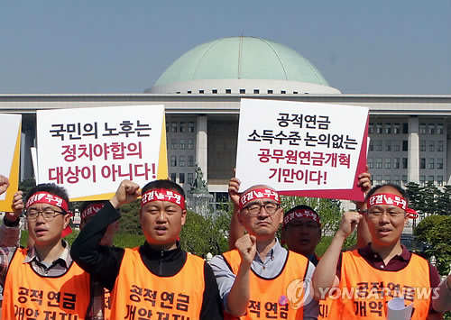 | △ 전국공무원노동조합 조합원들이 지난달 30일 서울 영등포구 국회의사당 앞에서 국민연금 소득대체율 상향과 공적연금 강화를 요구하며 구호를 외치고 있다. |