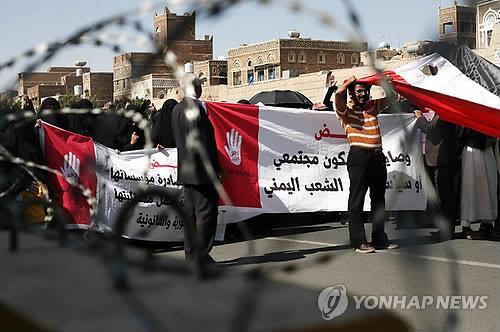 | △ (EPA=연합뉴스) 지난 1월17일 예멘 사나에서 시민들이 '모든 종류의 테러리즘에 반대한다'는 내용이 적힌 현수막을 들고 시위를 하고 있다. |