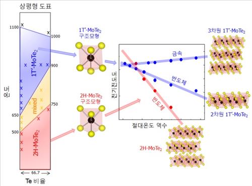 미래창조과학부는 기초과학연구원(IBS)의 나노구조물리연구단 연구팀과 성균관대, 한국과학기술원(KAIST)이 공동으로 섭씨 15도 정도의 상온에서는 반도체 상태였다가 섭씨 500도 이상의 열을 가한 후 다시 상온으로 온도를 낮추면 도체 상태로 바뀌는 2차원 층상구조의 '다이텔레륨몰리브데늄(MoTe2)'을 개발했다고 5일 밝혔다.
