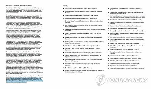 퓰리처상을 수상한 허버트 빅스(미국 빙엄턴대학), 디어도어 쿡·하루코 다야 쿡(미국 윌리엄 패터슨 대학), 존 다우어(미 매사추세츠공과대학) 등 미국과 유럽, 호주에서 활동 중인 일본학 전공 역사학자 187명은 이날 연합뉴스와 연합뉴스TV를 통해 아베 신조 일본 총리에게 일본군 위안부 문제와 관련한 역사적 사실을 왜곡하지 말고 정면으로 인정할 것을 촉구하는 집단성명을 발표했다.