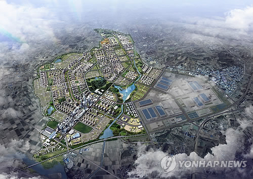 | △ 삼성전자가 2016년 말까지 392만㎡ 규모로 반도체 생산라인을 조성할 계획으로 알려진 평택시 고덕국제신도시의 조감도. (연합뉴스 자료사진) |
