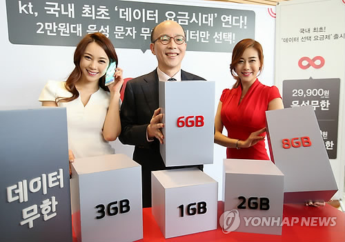 KT[030200]는 이날 LTE 고객을 상대로 국내 최초로 최저 2만9천900원부터 모든 요금 구간에서 음성 통화와 문자를 무제한으로 제공하는 대신 데이터 사용료에 따라 요금이 올라가는 구조의 '데이터 선택 요금제'를 출시했다.