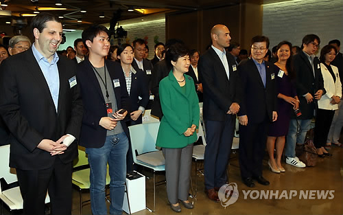 △ ‘구글 캠퍼스 서울’ 개소식 참석한 박 대통령 (서울=연합뉴스) 도광환 기자 = 박근혜 대통령이 8일 오전 서울 강남구 역삼동에서 열린 ‘구글 캠퍼스 서울’ 개소식에 참석, 착석하려 하고 있다. 박 대통령은 오른쪽은 카림 템사마니 구글 아태지역 총괄. dohh@yna.co.kr