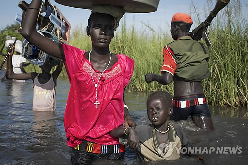 | △ 소리내지 말고 조용히 걸어 (AP=연합뉴스) 내전상태인 남수단 벤티우에서 누에르족 사람들이 20일(현지시간) 반군들의 호위 속에 유엔남수단임무단(UNMISS)의 난민촌으로 가기 위해 홍수로 허리까지 불어난 개울을 따라 조심스레 걸어가고 있다. marshal@yna.co.kr (AP Photo/Matthew Abbott) |