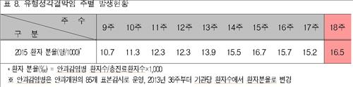 85개 안과 개원의원 통해 집계한 유행성 각결막염의 인구 1천명당 외래환자는 4월 26일~5월 2일 16.5명으로, 1주일 전의 15.2명보다 1.3명 많았다.