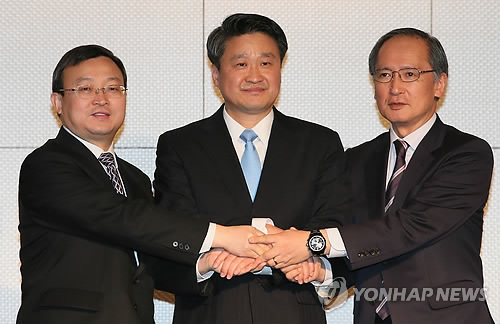 | △ 한중일 FTA 제7차 수석대표 협상 (서울=연합뉴스) 박지호 기자 = 12일 오전 서울 삼성동 코엑스 인터컨티넨탈호텔에서 열린 '한중일 FTA 제7차 수석대표 협상'에서 3국 수석대표가 포즈를 취하고 있다. 왼쪽부터 왕셔우원 중국 상무부 부부장, 김학도 산업통상자원부 통상교섭실장, 나가미네 야수마사 일본 외무성 경제담당 외무심의관. 2015.5.12 jihopark@yna.co.kr |