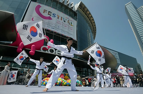 △ 'C-페스티벌 2015 개막 축하' (서울=연합뉴스) 홍기원 기자 = 30일 오전 서울 강남구 삼성동 코엑스 정문에서 아시아의 비즈니스 중심지로 육성하기 위한 문화 축제인 'C-페스티벌 2015' 개막식이 열려 축하공연을 하고 있다. 이 행사는 다음달 10일까지 무역센터와 코엑스에서 열린다. 2015.4.30 xanadu@yna.co.kr