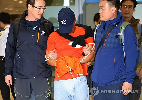 △ 국내송환된 '안양 환전소 살인사건' 피의자 (영종도=연합뉴스) 최수향 기자 = '안양 환전소 살인사건' 피의자 김성곤씨가 13일 오후 인천공항을 통해 압송되고 있다. 김씨는 국내에서 살인을 저지르고 필리핀으로 도주했다 8년만에 국내로 송환됐다.