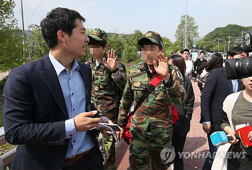 △ 조기퇴소한 예비군에 쏟아지는 질문 (서울=연합뉴스) 임헌정 기자 = 총기사고가 난 서울 내곡동 예비군훈련장에 입소한 예비군 가운데 일부가 14일 부대 버스를 타고 서초구 헌인릉 인근 버스정류장에 내린 뒤 취재진의 질문세례를 받고 있다.