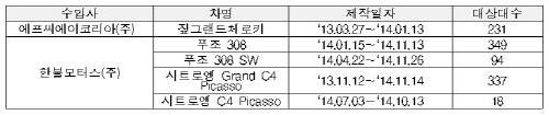 또 한불모터스가 수입한 푸조308(2014년 1월 15일∼11월 13일) 349대와 푸조308SW(2014년 4월 22일∼11월 26일) 94대, 시트로엥 Grand C4 Picasso(2013년 11월12일∼2014년 11월 14일) 337대, 시트로엥 C4 Picasso(2014년 7월 3일∼2014년 10월13일) 18대도 리콜을 실시한다.