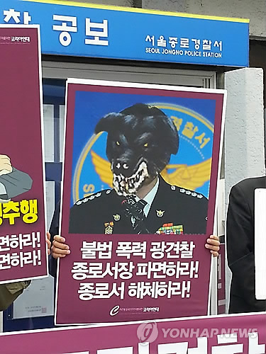 이들은 당시 연행이 부당하고 폭력적이었다고 주장하면서 경찰 정복 차림에 얼굴 부분이 개로 묘사된 윤명성 종로서장의 사진과 함께 '불법 폭력 광견찰 종로서장 파면하라'라는 등의 문구를 담은 피켓을 들었다.