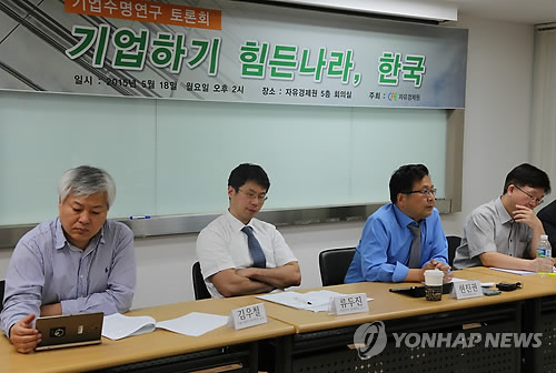 | △ "한국 신생기업, 10곳 중 7곳은 5년 내 폐업" (서울=연합뉴스) 18일 오후 서울 영등포구 여의도동 자유경제원에서 '기업하기 힘든 나라, 한국'을 주제로 토론회가 열리고 있다. (자유경제원 제공) |