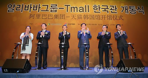 △ 알리바바 T-mall 한국관 개통식 (서울=연합뉴스) 한종찬 기자 = 최경환 부총리 겸 기획재정부 장관(오른쪽 세번째)과 마윈 알리바바 회장(오른쪽 네번째)이 18일 오후 서울 서초구 aT센터에서 열린 '알리바바 T-mall 한국관 개통식'에서 클릭 세리모니를 마친 뒤 박수를 치고 있다. 오른쪽 두번째는 이동필 농림축산식품부 장관.