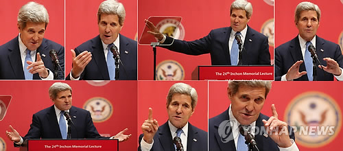 △ 존 케리 미국 국무장관의 다양한 제스처 (서울=연합뉴스) 임헌정 기자 = 존 케리 미국 국무장관이 18일 오후 서울 안암동 고려대학교 인촌기념관에서 '사이버안보'를 주제로 특별강연을 하며 다양한 제스처를 취하고 있다. 2015.5.18 kane@yna.co.kr