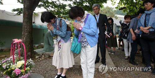 | △ 일본군 위안부 피해 할머니 추모하는 일본 시민단체 회원들 (경기광주=연합뉴스) 신영근 기자 = 19일 오후 경기도 광주시 퇴촌면 일본군 위안부 피해 할머니들의 보금자리 나눔의집을 찾은 일본 시민단체 '헌법9조 세계로 미래로 연락회(9조련)' 회원들이 돌아가신 위안부 피해 할머니들을 위해 헌화하며 추모하고 있다. 9조련은 20일 서울 종로구 일본대사관 앞에서 열리는 1천179차 수요집회를 주관할 예정이다. |