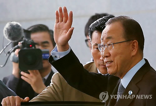 | △ 21일 개성공단을 방문하는 반기문 유엔 사무총장, 사진은 반기문 총장이 18일 오후 인천공항을 통해 입국해 인사말을 한 뒤 손을 흔들고 있는 모습. |