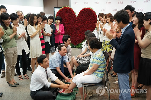 | △ 부부의 날을 맞아 남편들이 아내와 서로 간의 섬김과 헌신을 다짐하며 발을 닦아주고 있다. (연합뉴스 자료사진) |