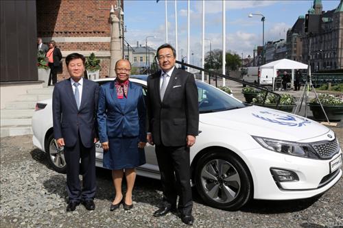 김경배 현대글로비스 사장은 19일(현지시간) 스웨덴 말뫼 세계해사대학에서 열린 차량 기증식에서 세키미츠 고지 국제해사기구(IMO) 사무총장, 클레오파트라 둠비아-헨리 세계해사대학 총장 등과 환담하고 차량을 전달했다.