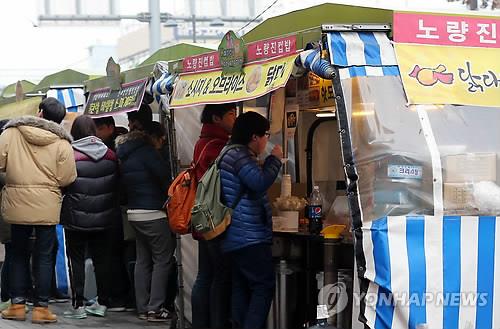 각종 수험학원들이 밀집해 있는 노량진역 주변에는 학원생들을 대상으로 한 노점들이 몰려 있다.